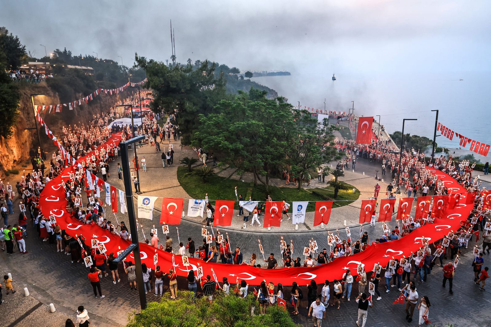 Konyaaltı Varyant’ta toplanan vatandaşlar ellerinde Türk bayrakları ve meşalelerle yürüdü. Fener alayına katılan on binlerce Antalyalı, 400 metrelik dev Türk bayrağı ve Atatürk posteri taşıyıp meşaleler eşliğinde yürüdü.