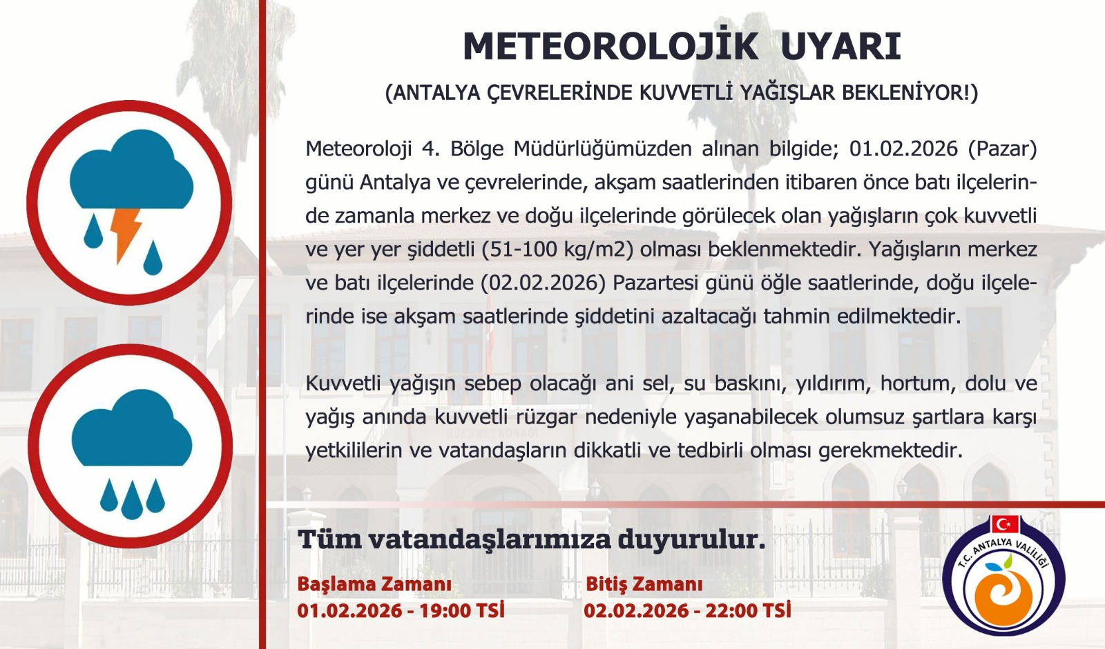 Meteoroloji ve Antalya Valiliği, kent genelinde etkili olması beklenen şiddetli yağış nedeniyle turuncu uyarı verdi. Pazar akşamından itibaren başlayacak yağışlarda sel ve taşkın riskine karşı vatandaşların dikkatli olması istendi.