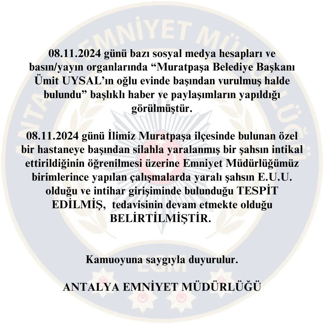 Antalya Emniyet Müdürlüğü, bazı sosyal medya hesapları ve basın/yayın organlarında “Muratpaşa Belediye Başkanı Ümit Uysal’ın oğlu evinde başından vurulmuş halde bulundu” başlıklı haber ve paylaşımlarına ilişkin basın bildirisi yayınladı. Yaralı şahsın E.U.U. olduğunu ve intihar girişiminde bulunduğunu belirten Antalya Emniyet Müdürlüğü, tedavi sürecinin devam ettiği bilgisini paylaştı.