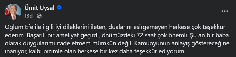 BAŞKAN UYSAL, OĞLUNUN SON DURUMUYLA İLGİLİ AÇIKLAMAYI SOSYAL MEDYA SAYFASINDAN YAPTI