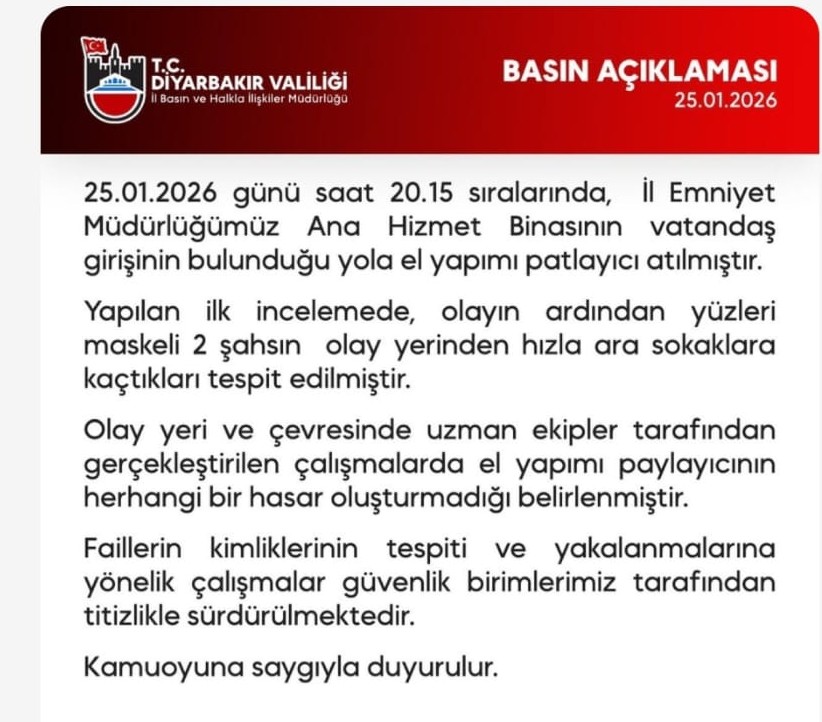 Diyarbakır Valiliği, İl Emniyet Müdürlüğü’nün vatandaş girişinin bulunduğu yola el yapımı patlayıcı atıldığı bilgisini paylaştı. Valilik açıklamasında, olayın ardından yüzleri maskeli iki şüphelinin olay yerinden ara sokaklara kaçtığı ve polis ekiplerinin şüphelileri yakalamak için çalışma başlattığı bildirildi.