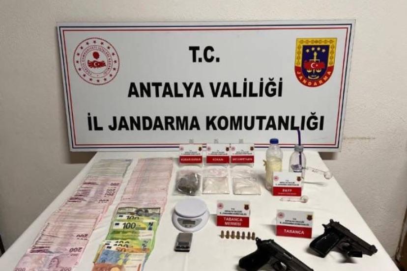 Antalya İl Jandarma Komutanlığı tarafından Döşemealtı’nda bir adrese ve araca düzenlenen operasyonda skunk, kokain, metamfetamin ve ruhsatsız silahlar ele geçirildi. Bir şüpheli hakkında adli tahkikat başlatıldı.