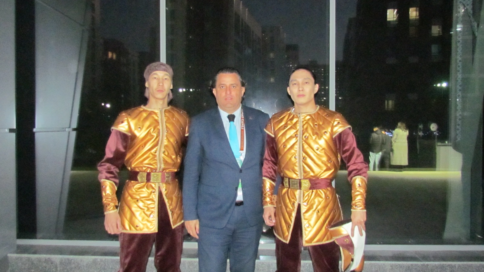 Türkiye'den giden ilk Etnospor kafilesi Kazakistan'ın Astana şehrinde havalimanında Dombra müziği ile karşılandı.