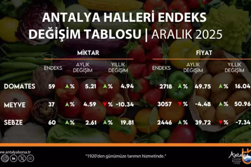 ANTALYA Ticaret Borsası (ATB), 2025 yılı Aralık ayına ilişkin hal endeksi verilerini kamuoyuyla paylaştı. Antalya hallerinde işlem gören domates, meyve ve sebzeye ait miktar ve fiyat endeksleri, hem aylık hem de yıllık bazda dikkat çekici değişimler gösterdi.