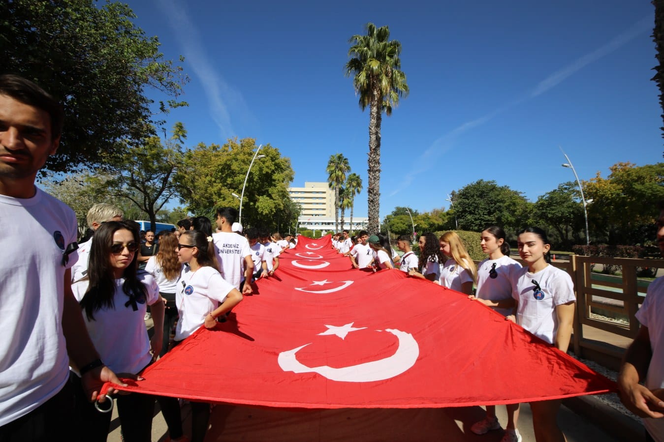 Rektör Prof. Dr. Özlenen Özkan TUSAŞ ziyaretinin ardından Akdeniz Üniversitesi’nde 29 Ekim Cumhuriyet Bayramı kapsamında düzenlenen Cumhuriyet İçin Koş Akdeniz etkinliğine katıldı. Etkinlik, yaşanan terör saldırısı nedeniyle yürüyüş olarak düzenlenirken, öğrenciler ve akademisyenler dev Türk bayrağı ile kampüs içinde yürüyüş gerçekleştirdi. Akdeniz Üniversitesi Rektörlüğü önünden başlayan yürüyüşe Rektör Prof. Dr. Özlenen Özkan, Rektör Yardımcıları Prof. Dr. Şükrü Özen, Prof. Dr. Cengiz Toker, Genel Sekreter Ali Evren İmre de katıldı.
