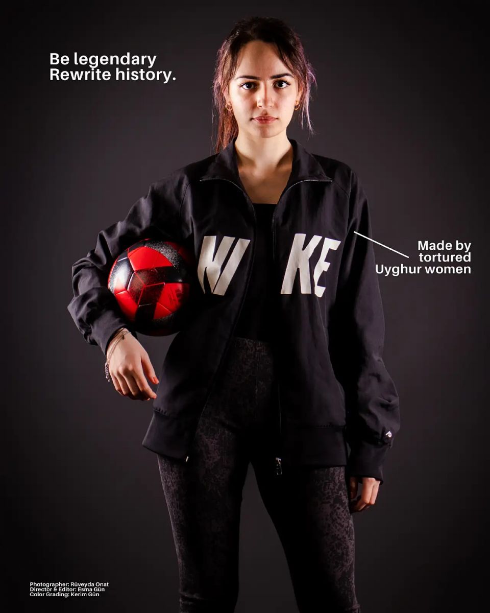 Bu iddia Amerika Birleşik Devletleri tarafından fonlanan Uygur derneklerinin propaganda afişlerinde kullanıldı, afişlerde Esma Gün de model olarak yeraldı. Afişte yazan İngilizce metnin Türkçesi şöyle: İşkence gören Uygur kadınları tarafından üretildi.