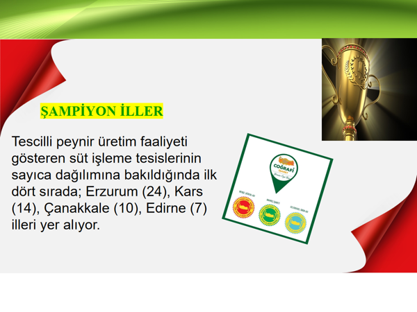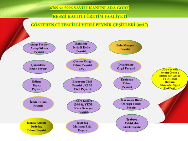 “ANTEP SIKMA PEYNİRİ, BALIKESİR İVRİNDİ KELLE PEYNİRİ, BOLU MENGEN PEYNİRİ, ÇANAKKALE EZİNE PEYNİRİ, ÇORUM KARGI TULUM PEYNİRİ, DİYARBAKIR ÖRGÜ PEYNİRİ, EDİRNE BEYAZ PEYNİRİ, ERZURUM CİVİL VE KÜFLÜ CİVİL PEYNİRİ, ERZİNCAN TULUM PEYNİRİ,