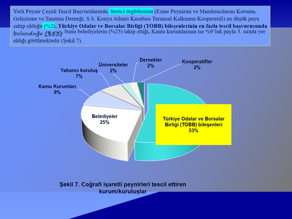 Araştırma sonuçlarına göre; Ülkemizde 31 farklı ilde 42 adet yerli ve 4 adet yurt dışı menşeli olmak üzere toplam 46 peynir çeşidinin tescilli olduğu, “Peynirler” ürün grubunda “Ezine Peyniri”nin 2023 yılında AB nezdinde koruma altına alınan ilk ve halen tek peynir çeşidi olduğu, Erzincan Tulum Peyniri, Erzurum Civil Peyniri ve Erzurum Küflü Civil Peyniri/Göğermiş Peynir ise halen başvuru aşamasında olup tescil süreci devam ettiği belirtilmiştir. İİllere göre TÜRKPATENT veri tabanında üretici bilgisi olmayan 20 çeşit Cİ tescilli peynir olduğu vurgulanmıştır.