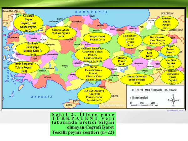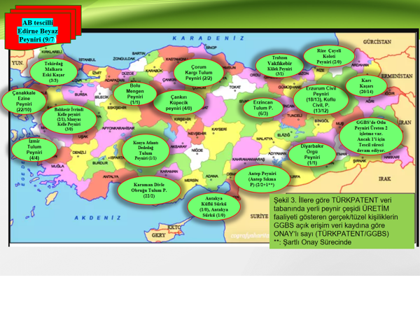 Çalışmada, illere göre TÜRKPATENT veri tabanında yerli peynir çeşidi ÜRETİM faaliyet gösteren gerçek/tüzel kişiliklerin, Tarım ve Orman Bakanlığı tarafından oluşturulan açık erişimli Gıda Güvenliği Bilgi Sistemi (GGBS) veri kaydındaki onay durumu incelenmiş, buna göre 136 firmanın 77’sinin (%56.61) bu veri kaydında yer aldığı aktarılmıştır.